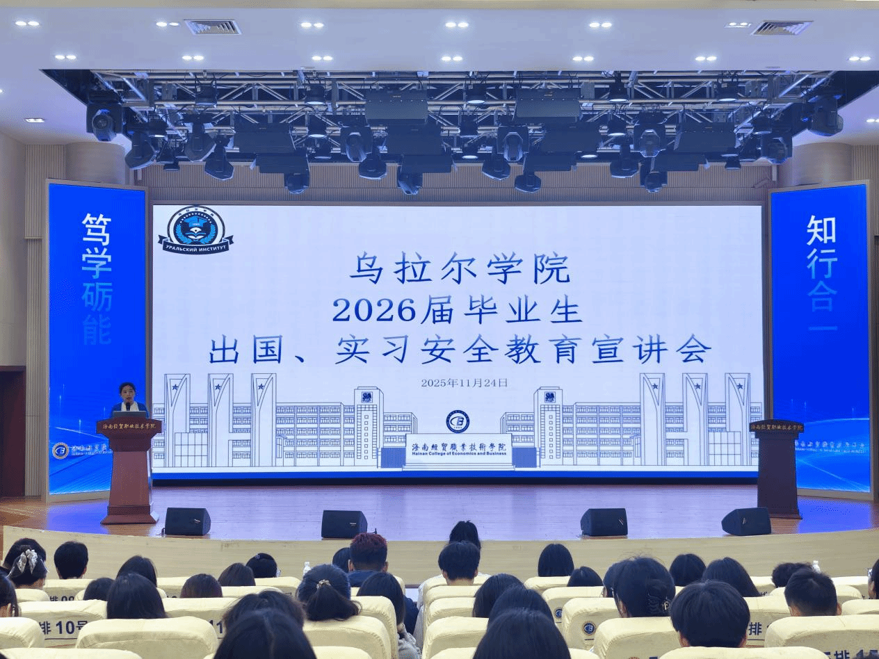 2025年11月24日,乌拉尔学院在图书馆报告厅召开2026届毕业生出国动员会暨实习宣讲会。国际教育学院、乌拉尔学院党总支书记于勇,国际教育学院、乌拉尔学院院长周丽霞,各专业负责人、实习指导老师、全体辅导员及2023级全体学生齐聚一堂,为毕业生们的出国深造与实习实践之路答疑解惑、保驾护航。