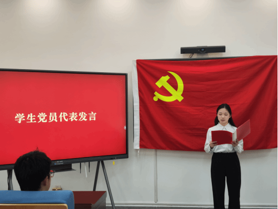 学生党员代表谭颖同志向新党员表达诚挚祝福,结合自身的成长历程,倡议全体学生党员携手共进、互促提升,在学习与服务师生中发挥先锋模范作用。