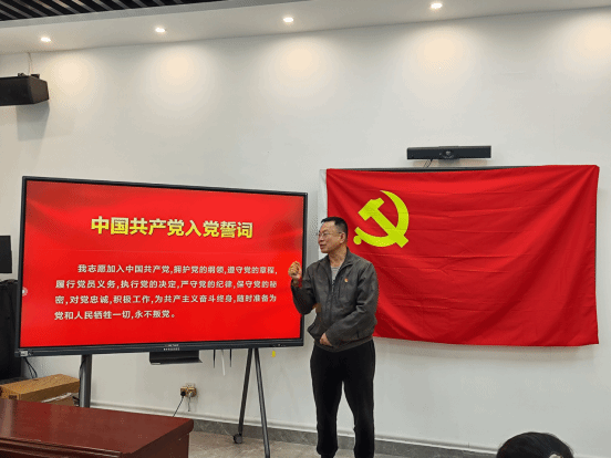 宣誓仪式在雄壮激昂的《国际歌》旋律中拉开帷幕。党支部书记陈青云同志首先向新加入党组织的同志致以热烈欢迎,随后带领新发展党员面向党旗,举起右拳庄严宣誓。铿锵有力的誓言回荡现场,彰显着新党员对党忠诚、为党的事业奋斗终身的坚定决心。