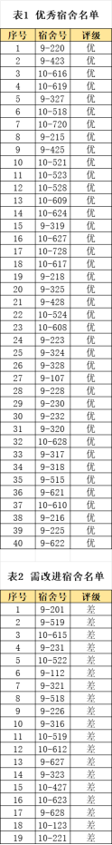 活动当日,在党总支书记于勇的带领下,全体学工及团学干部、志愿者们深入宿舍共同开展宿舍全面检查,围绕宿舍卫生、宿舍文化、安全纪律、文明行为等考核指标对所有宿舍进行综合考核,以评比促整改,切实将宿舍环境优化落到实处。现将检查结果公示如下: