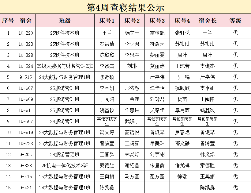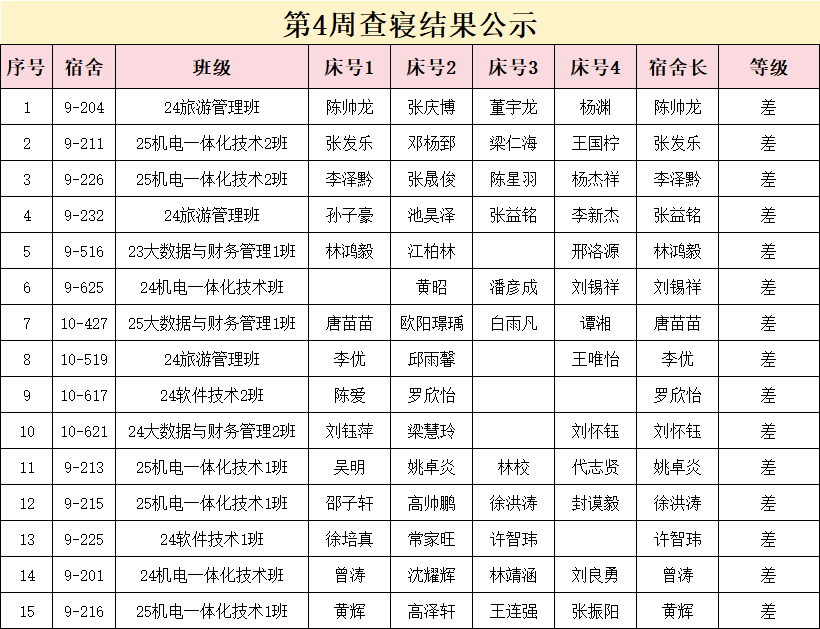 活动当日,学院团学干部、志愿者们深入宿舍共同开展宿舍全面检查,围绕宿舍卫生、宿舍文化、安全纪律、文明行为等考核指标对所有宿舍进行综合考核,以评比促整改,切实将宿舍环境优化落到实处。现将检查结果公示如下: