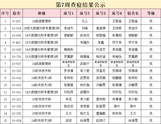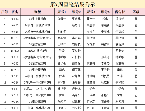 活动当日,学院团学干部、志愿者们深入宿舍共同开展宿舍全面检查,围绕宿舍卫生、宿舍文化、安全纪律、文明行为等考核指标对所有宿舍进行综合考核,以评比促整改,切实将宿舍环境优化落到实处。现将检查结果公示如下: