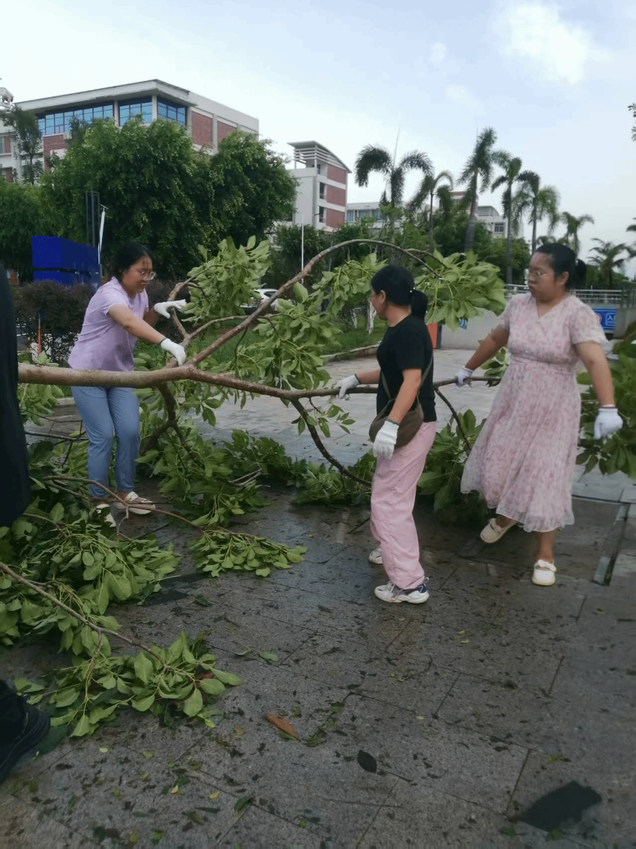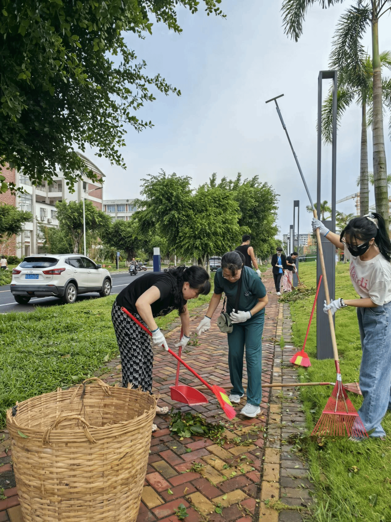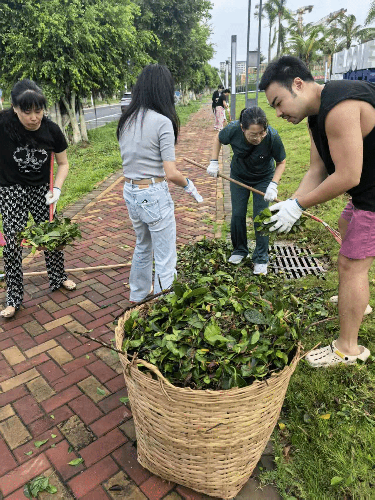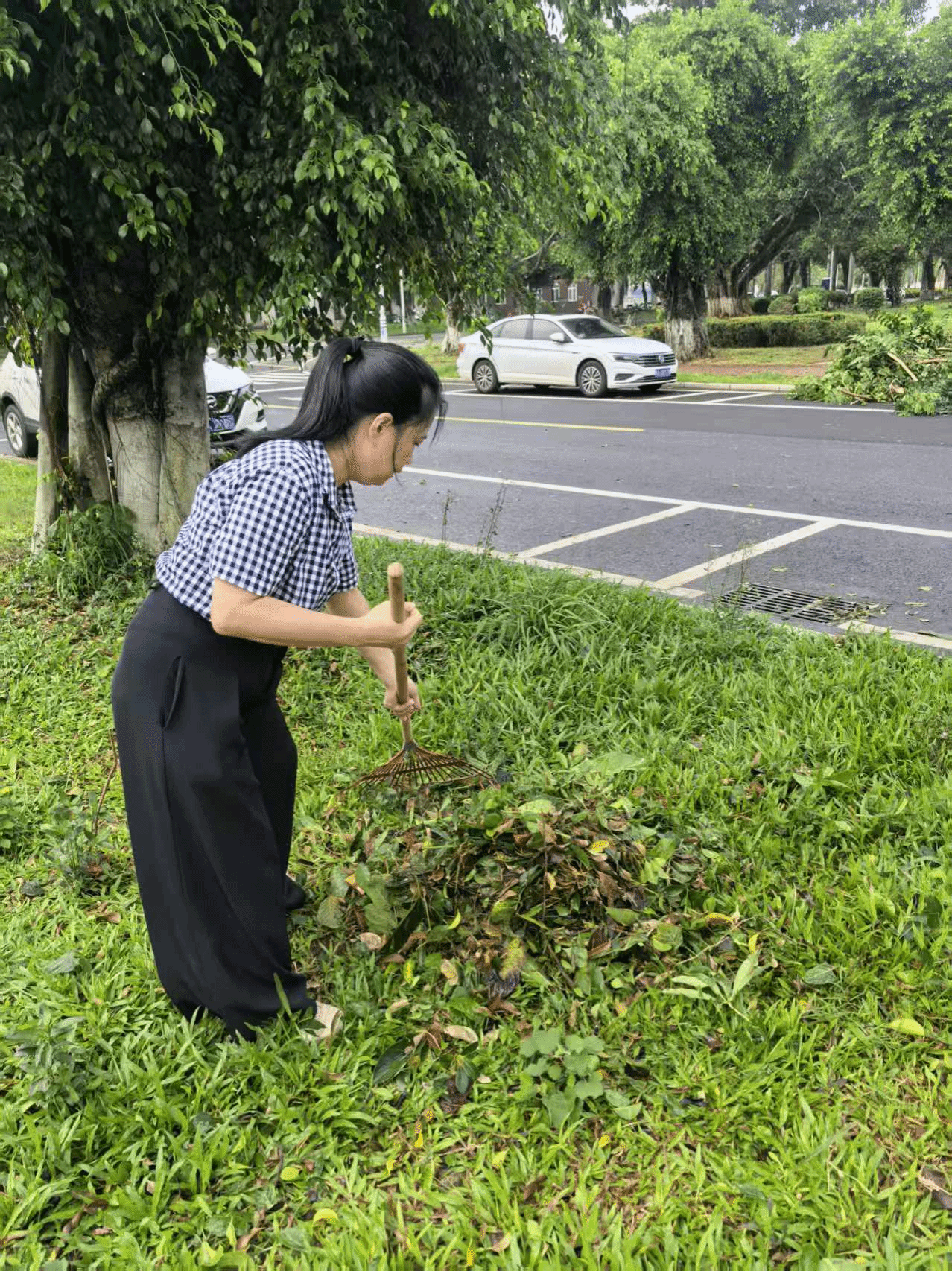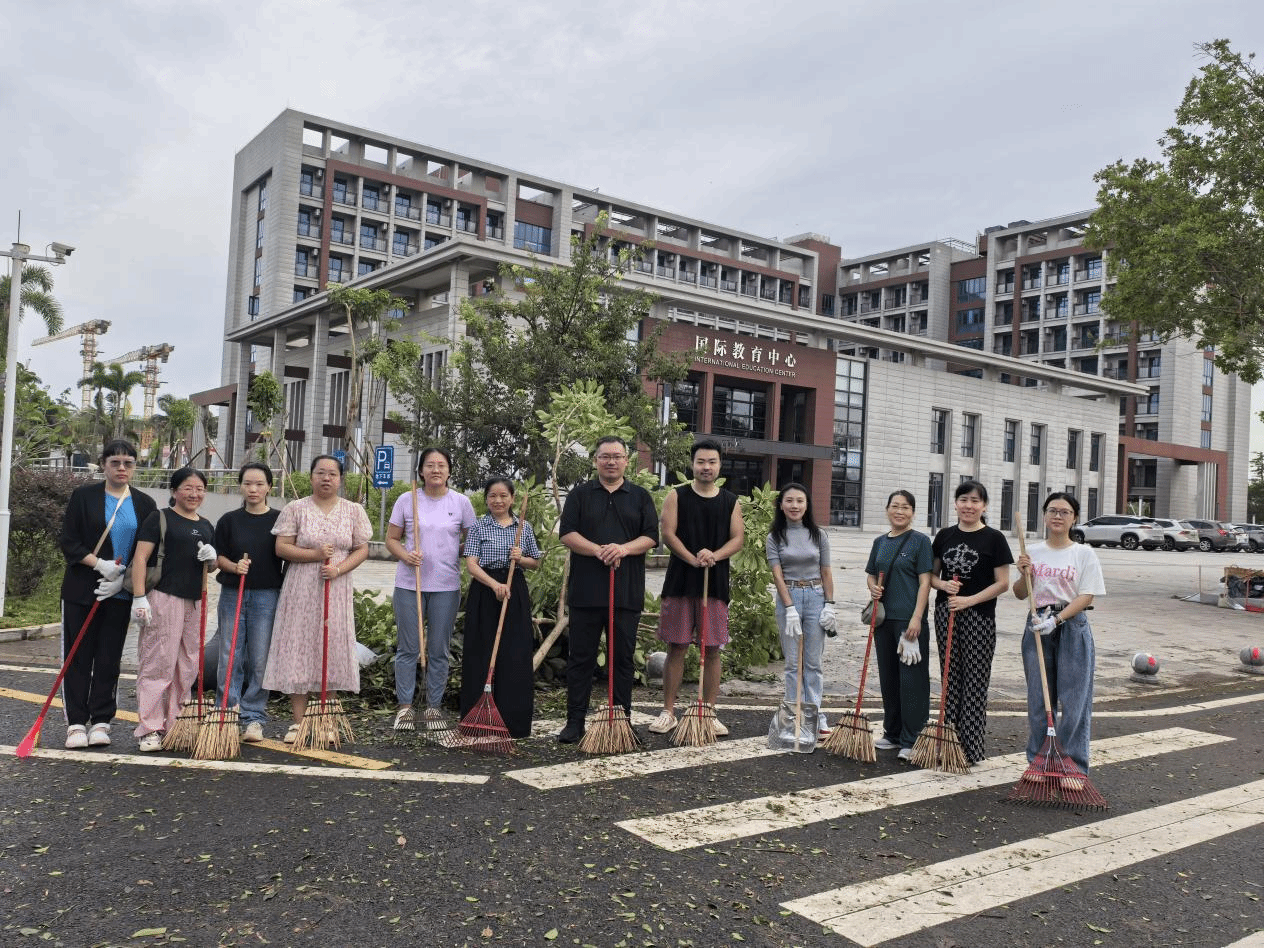 10月6日清晨,学院教职工志愿者队伍迅速集结,携带清扫工具对国际教育中心楼周边、校园道路、公共活动场地展开集中清理。大家分工明确、相互配合,重点清除被台风刮落的树枝、落叶、断枝及各类杂物,经过数小时协作,校园主干道、公共区域恢复整洁畅通,为师生出行扫清障碍。